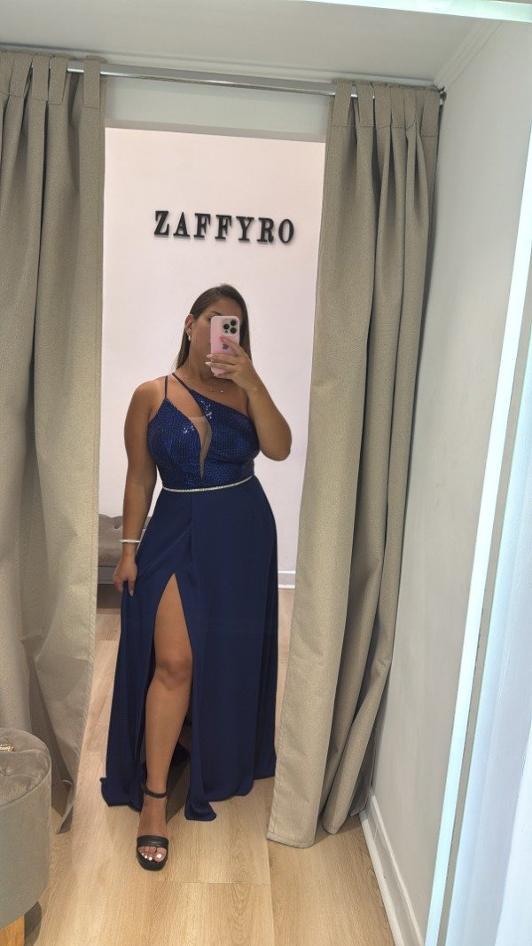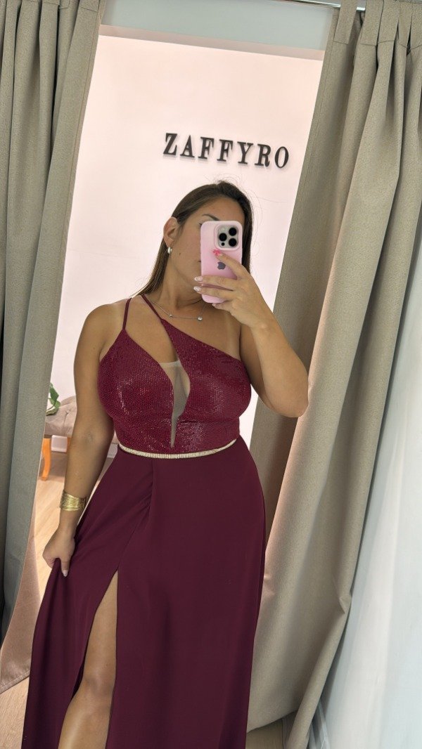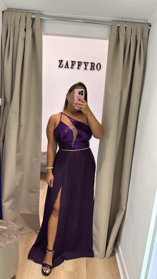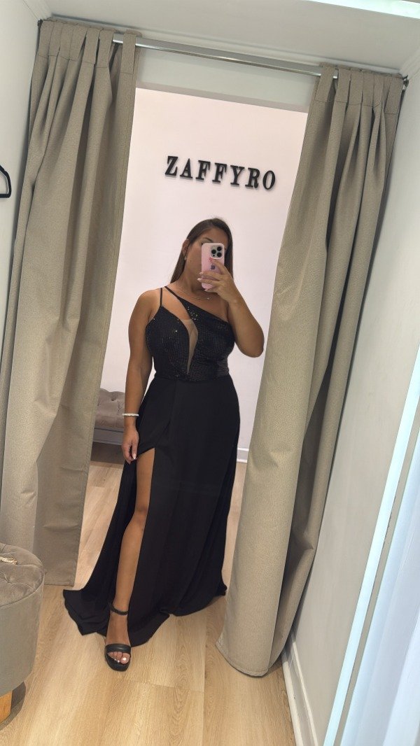 Vestido con pechera de lentejuelas tipo transfer forrado en la parte interna, falda de gasa con tajo y cierre en la espalda baja.
